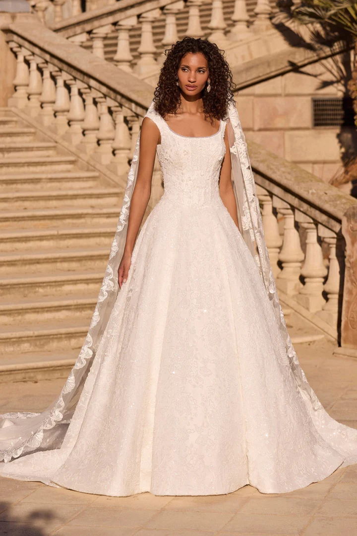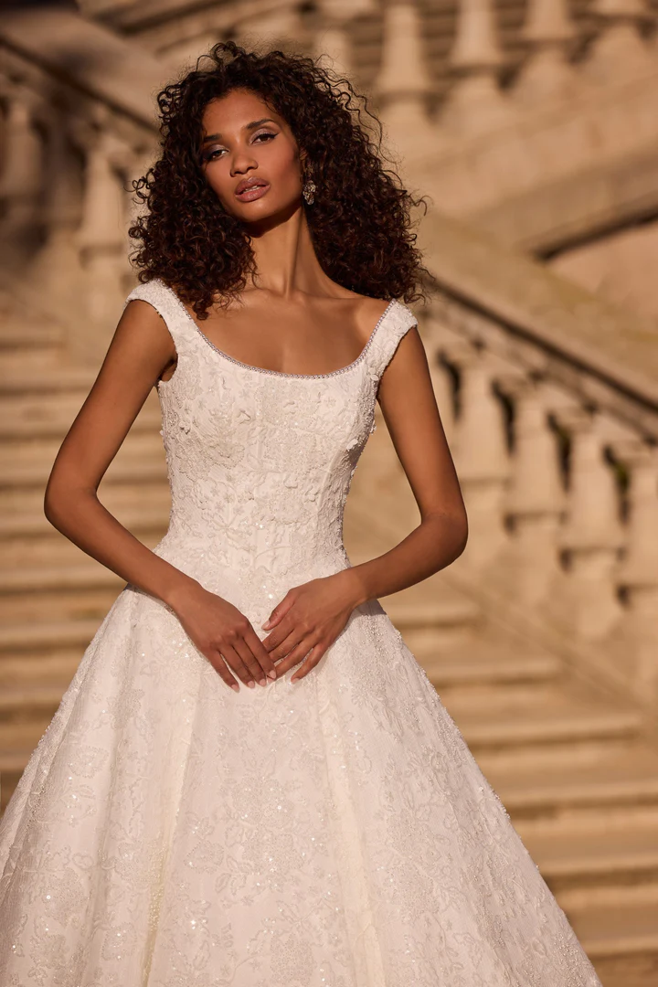Step into your fairytale moment with, a breathtaking beaded lace princess ballgown designed to enchant. This romantic gown features a classic round neckline adorned with a delicate beaded pearl trim that adds a soft, luxurious touch.