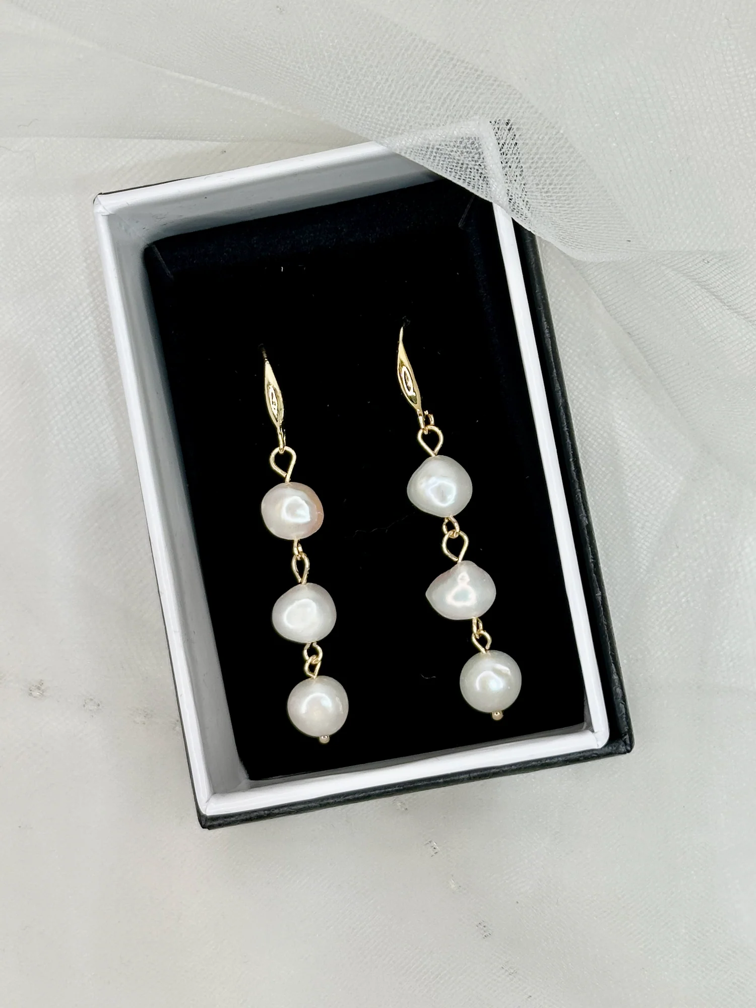 Lift your bridal ensemble with the Lettie Earrings, featuring three lustrous real freshwater pearls delicately suspended from elegant gold-plated hooks. These earrings offer a timeless sophistication, perfectly complementing your special day. Presented in a refined display box, they make an exquisite gift or keepsake.