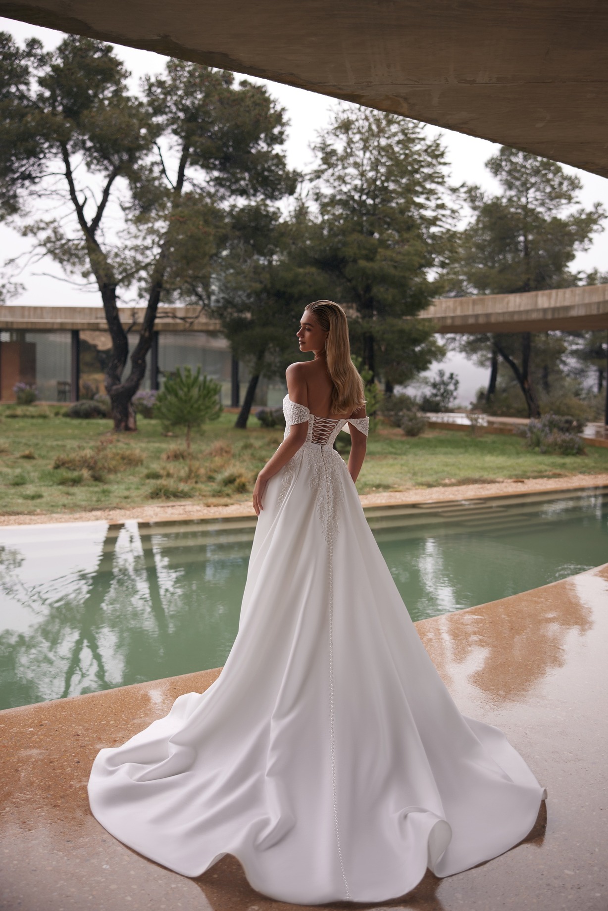 Crafted in Eva Lendel’s signature clean, contemporary style, Oda features a beautifully structured silhouette that flatters from every angle. The bodice is designed with soft corsetry and a romantic neckline that enhances the décolletage, creating an effortlessly elegant look.